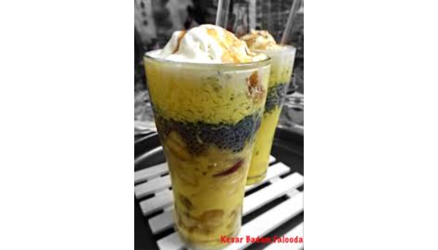 An indulgent saffron-infused dessert drink layered with falooda sev (vermicelli), soaked basil seeds (sabja), chilled saffron milk, and a scoop of creamy vanilla ice cream. Topped with nuts, dried fruits, and a drizzle of aromatic kesar syrup. A luxurious twist on the classic falooda.