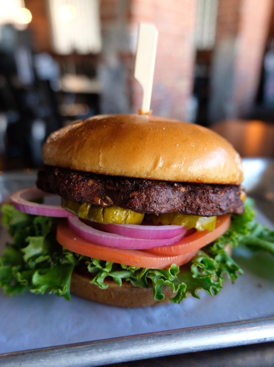 Black bean patty, lettuce, tomato, onion, pickles, brioche bun.