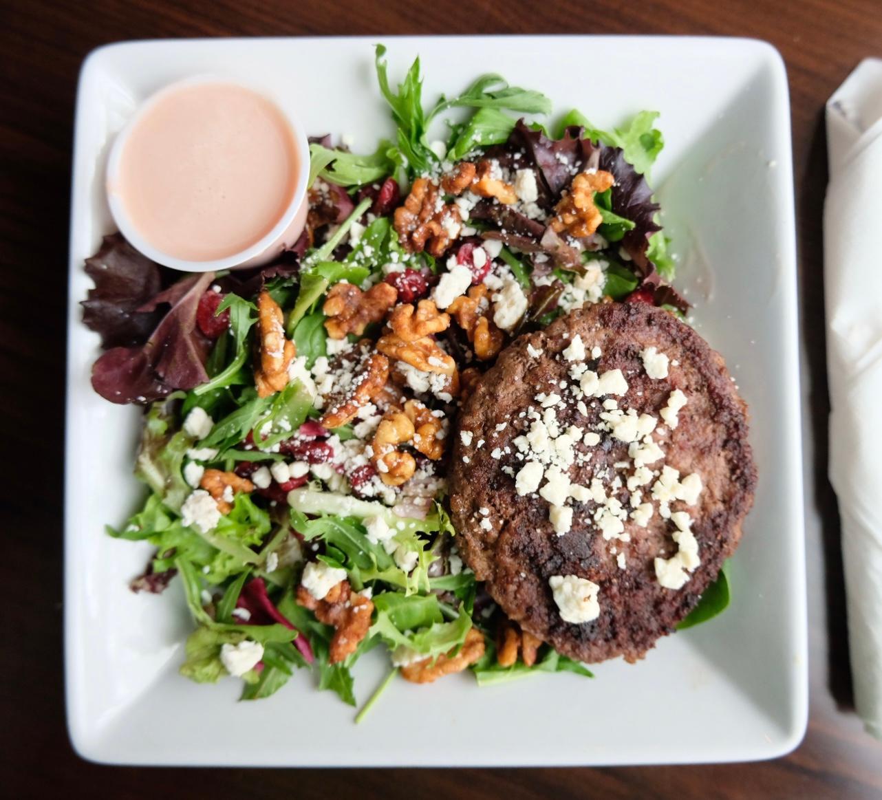 Mixed greens, dried cranberries, toasted walnuts, bleu cheese crumbles, burger patty, house red wine vinaigrette.